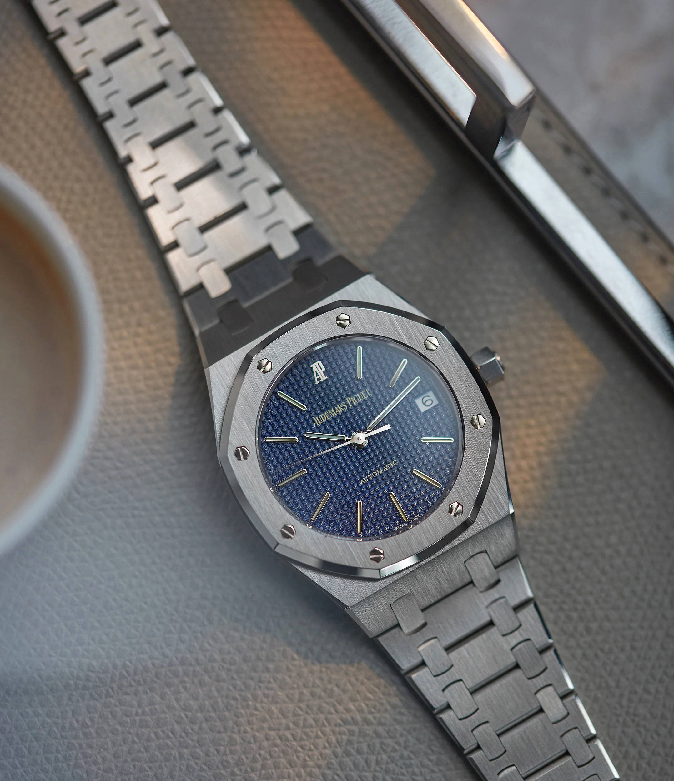 This Audemars Piguet Royal Oak 14790ST features an unusual Yves Klein dial, which has faded from a vibrant blue to a lighter, washed out shade over time. The combination of the 36mm stainless steel Royal Oak case and this characterful dial is certainly a powerful one.