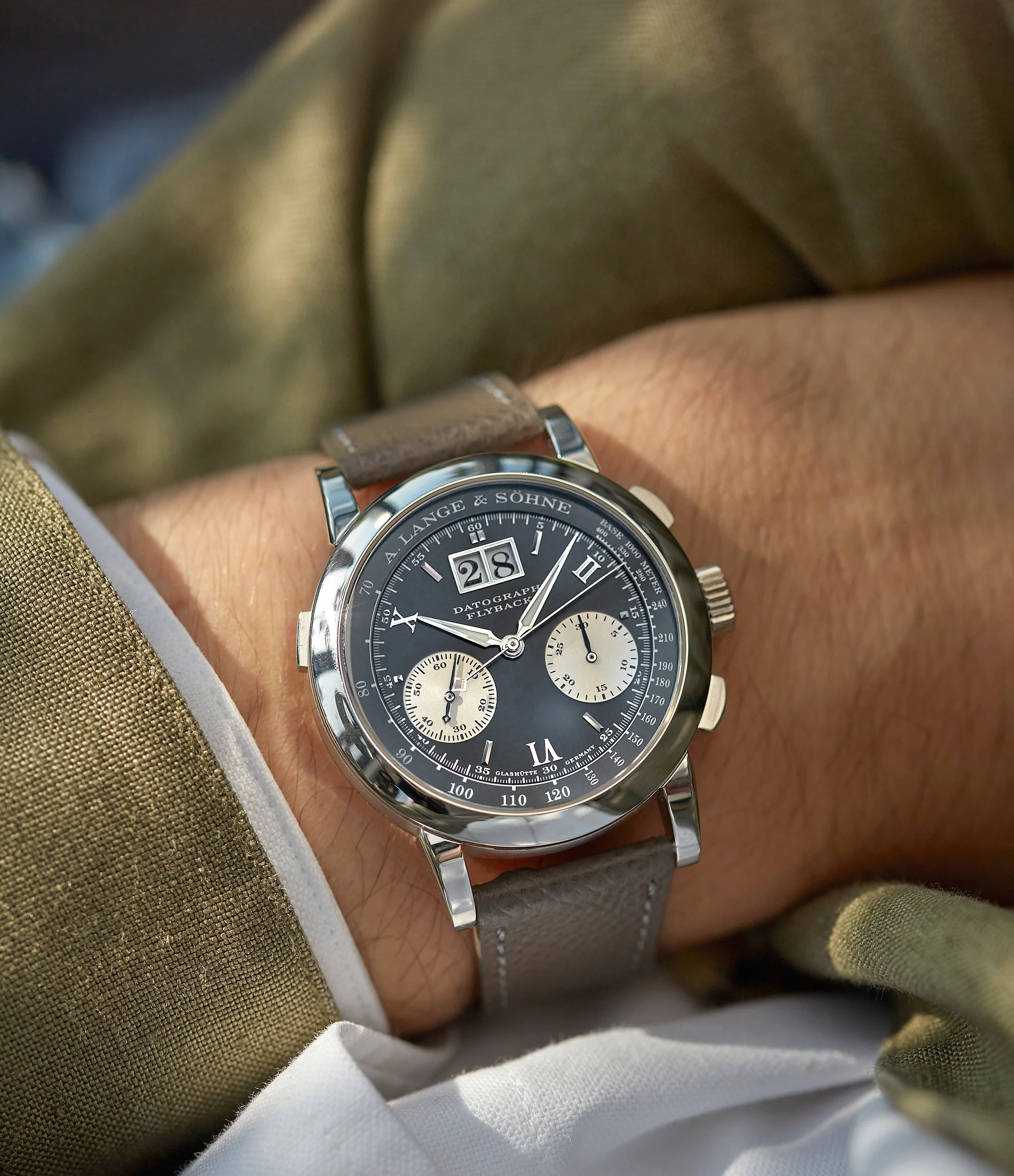This A. Lange & Söhne Datograph 403.035 comes with its box and manual. It comes on our Zürich grained strap in taupe, along with its corresponding platinum tang buckle.