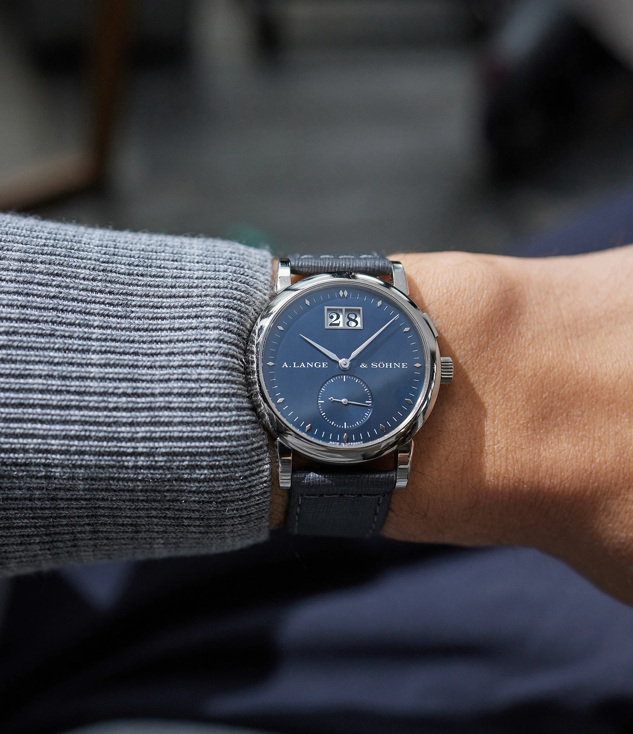 The first Saxonia, the ref. 102.001, was introduced in yellow gold, with a silver dial and a closed caseback. Three years later, A. Lange & Söhne expanded the Saxonia collection, introducing platinum and white gold cases, as well as versions with integrated bracelets or set with precious gems. This particular model, the ref. 105.027, was produced from 1997 to 2002, combining a classic white gold case with an unusually striking blue dial. This is perhaps one of the most contemporary configurations found during the early days of A. Lange & Söhne, with a similar configuration of the Lange 1 having been produced around the same time.