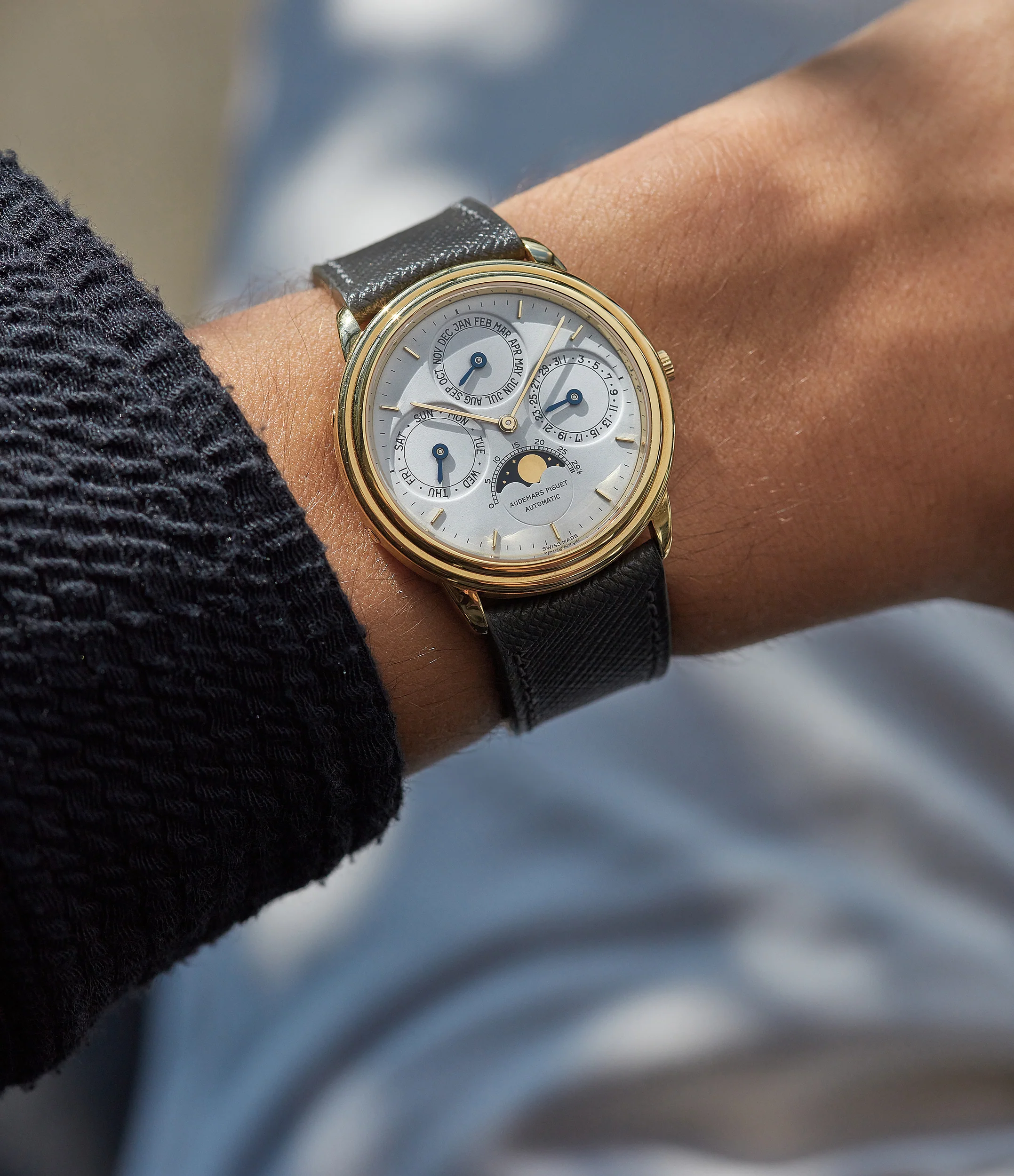 In 1977, they surprised George Golay, the CEO of Audemars Piguet at the time, with the finished calibre. A risk taker who’d already released the Royal Oak a few years prior, Golay was confident that the manufacture could successfully commercialise the automatic perpetual calendar. When it was launched in 1978, the Quantième Perpetuel was the world’s thinnest automatic perpetual calendar. To put things in perspective, in 1984, only 1,066 perpetual calendars were produced in Switzerland. Of those, Audemars Piguet made 675.
