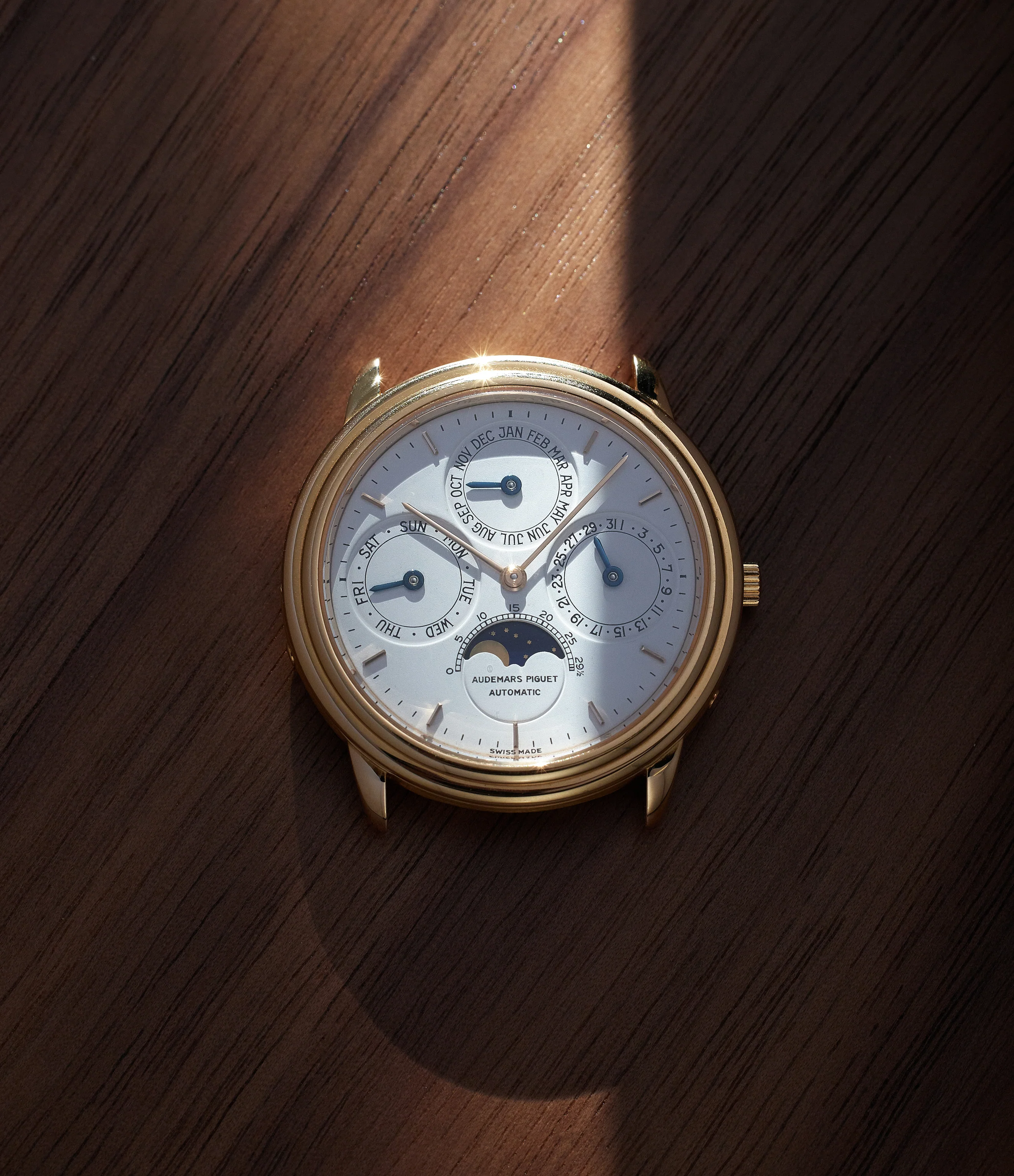 In 1977, they surprised George Golay, the CEO of Audemars Piguet at the time, with the finished calibre. A risk taker who’d already released the Royal Oak a few years prior, Golay was confident that the manufacture could successfully commercialise the automatic perpetual calendar. When it was launched in 1978, the Quantième Perpetuel was the world’s thinnest automatic perpetual calendar. To put things in perspective, in 1984, only 1,066 perpetual calendars were produced in Switzerland. Of those, Audemars Piguet made 675.
