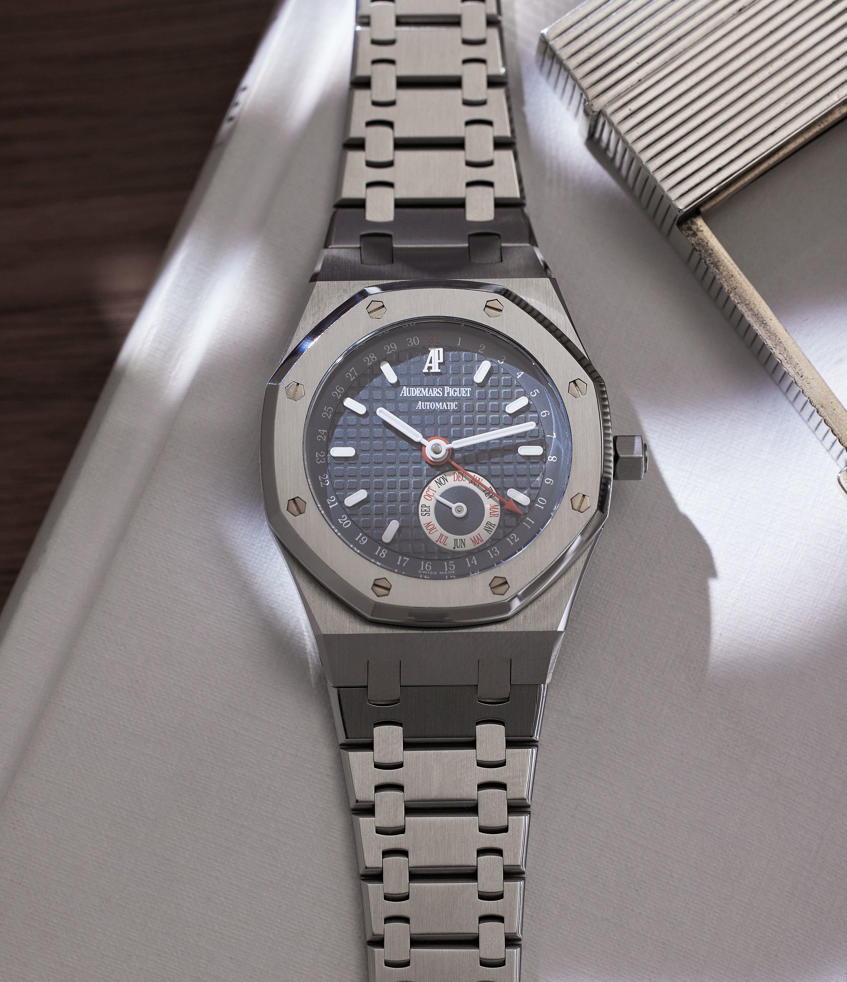 Initially designed as a luxury steel watch, the Royal Oak has since gone through many iterations, with this piece remaining close to its roots with a stainless-steel case and dark-grey dial.The multi-levelled dial features a radial date and an off-centre month sub-dial. The contrast between the tapisserie pattern in the centre and the brushed outer section lends a satisfying depth to the dial, especially when it catches the light. Unlike with some other examples, the radial date is found on the outermost section of the dial, enclosing the index markers and month sub-dial.