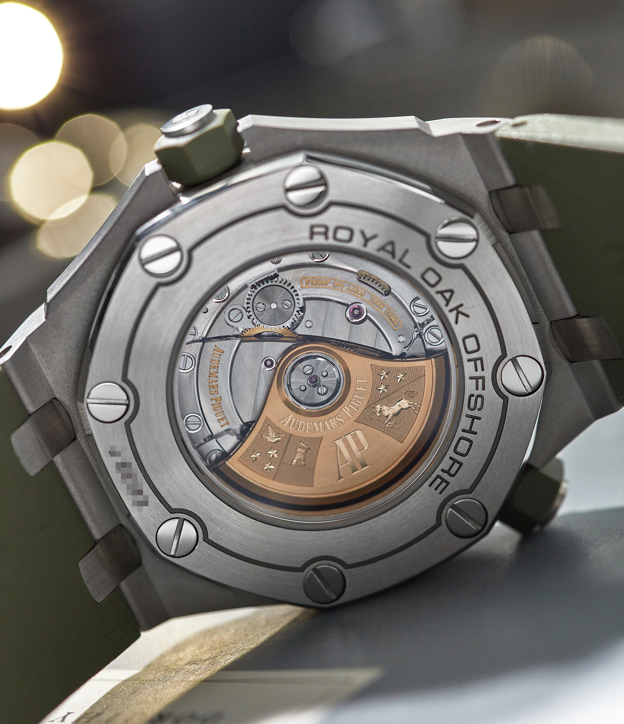 This Ref. 15710 has a clear sapphire caseback which displays Audemars Piguet’s modern caliber 3120, complete with an engraved 22-carat gold rotor. It contains a Gyromax balance wheel, a detached escapement, and rhodium plated bridges that have bevelled edges and are beautifully finished with Côtes de Genève. The rotor displays two engravings, one of the Audemars Piguet emblem, a bird with three stars, and a castle pass with a flag, the other of a rearing stallion accompanied by three stars. The movement is fitted with 40 jewels and has a 60-hour power reserve.