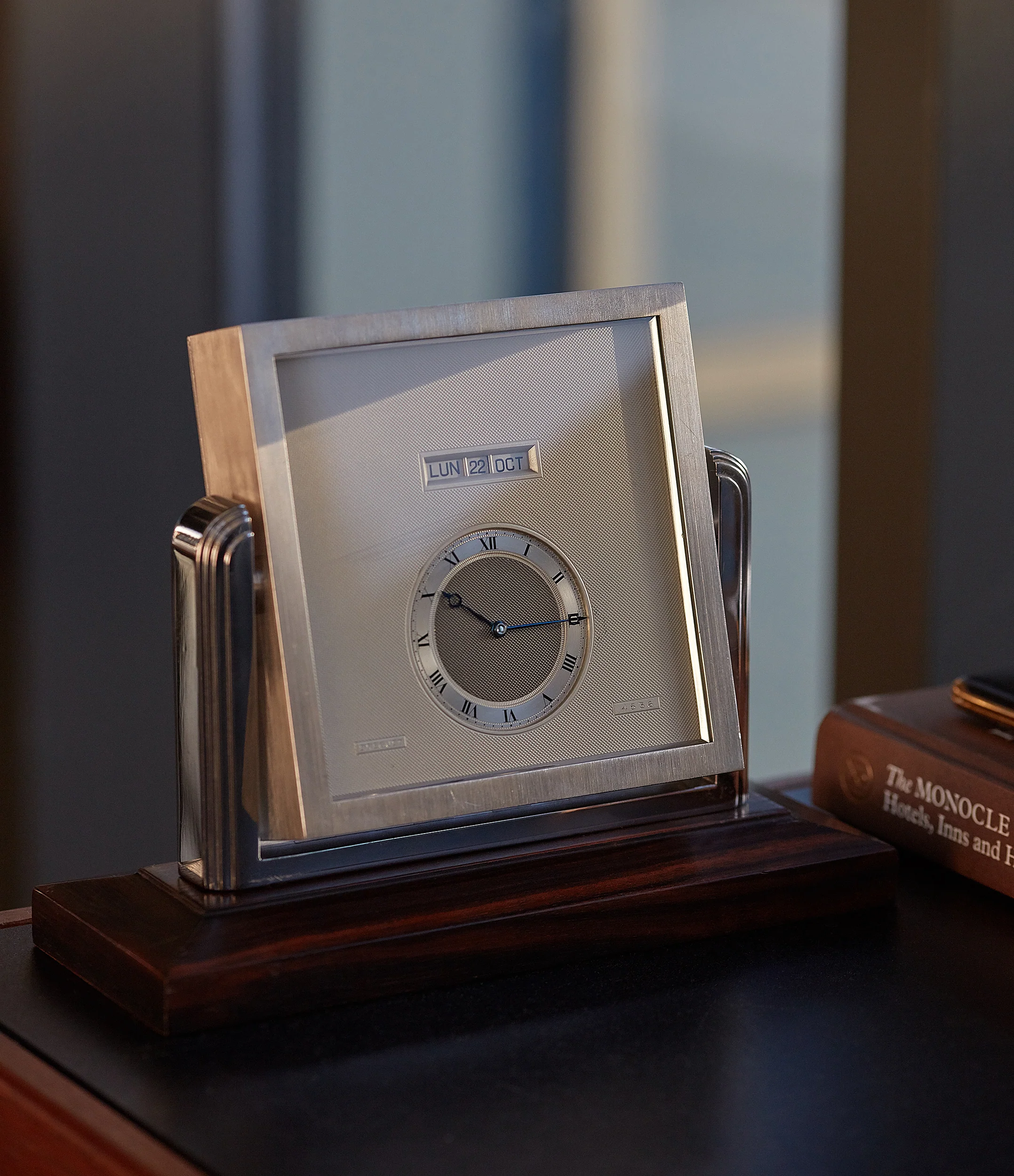 A silver, 8-Day perpetual calendar desk clock (No. 4536), manufactured by Breguet in 1931. Widely attributed as one of the first to develop a functioning perpetual calendar watch, Breguet’s long-standing association with the complication dates back to the late 18th century. It’s one of the more sophisticated and charming high complications, accounting for the long and short months, when calculating day and date (including February 29th, in leap years).This 8-Day Perpetual Calendar Desk Clock is executed in a typically Art Deco style. The pivoting, polished silver case is compact, with bold design flourishes. Perfectly executed for desk height. The stylised shoulders illustrate many of the aesthetic influences of the period, supporting the squared case, itself resting on its original wooden base.
