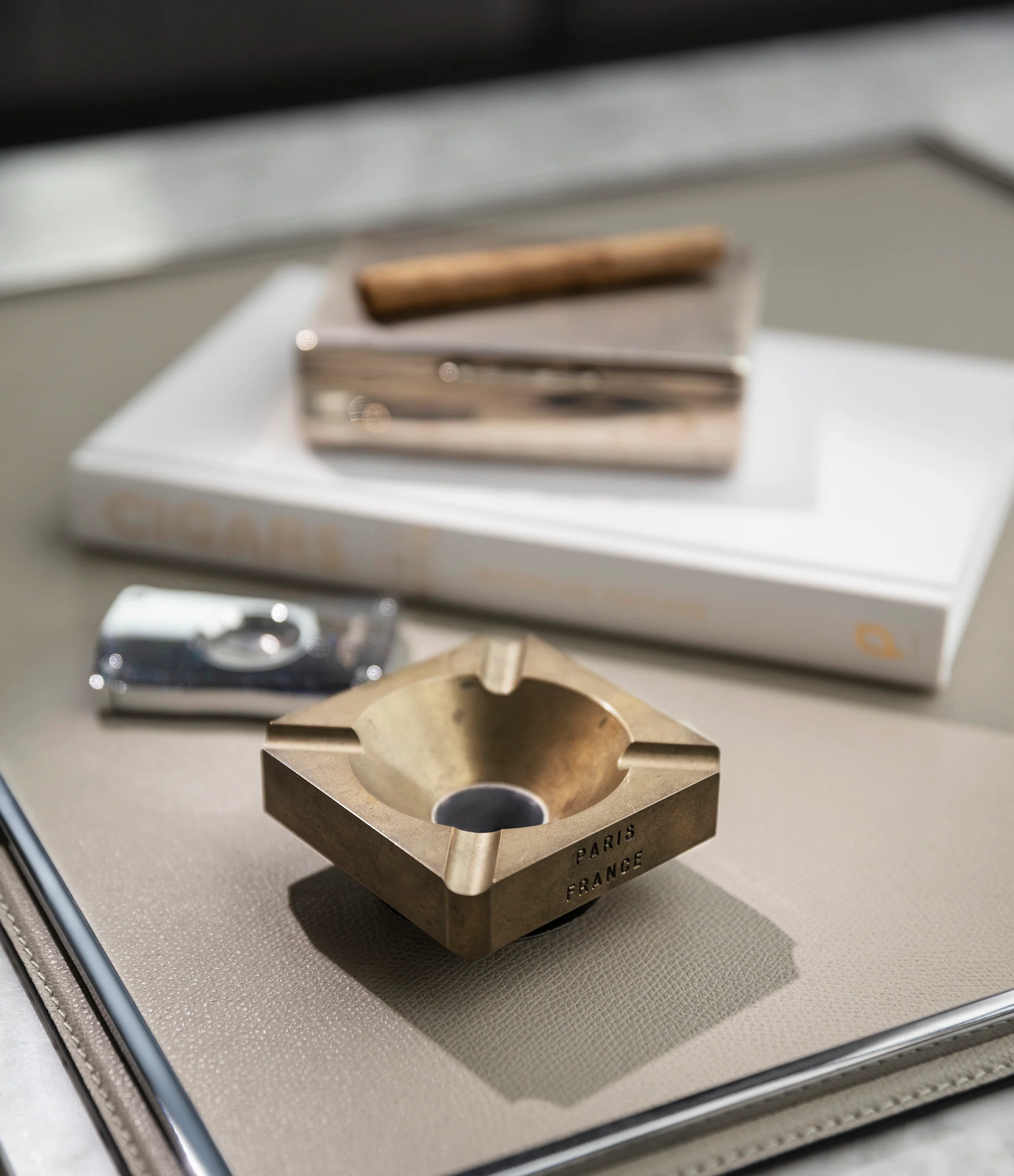 Built with function and purpose in mind, in each corner, a curved indent is designed to hold a cigarette or slim cigar, making the design both functional yet visually appealing. The centre of the ashtray slopes down into a brushed, circular bowl, in contrast to the sharp lines of the ashtray’s body.