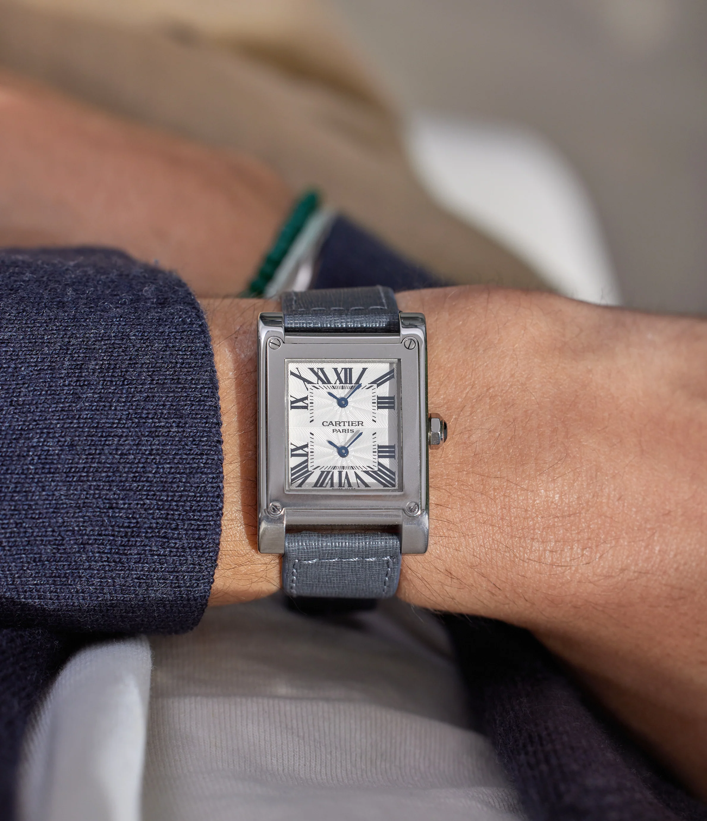 The white-gold case follows the classic lines of the original Tank from 1917, which was inspired by the Renault tanks which Louis saw in use on the Western Front. Meanwhile, the dial is signed “Cartier Paris” at the centre – a nod to some pieces from the early 20th century which had the city’s name inscribed below the brand.