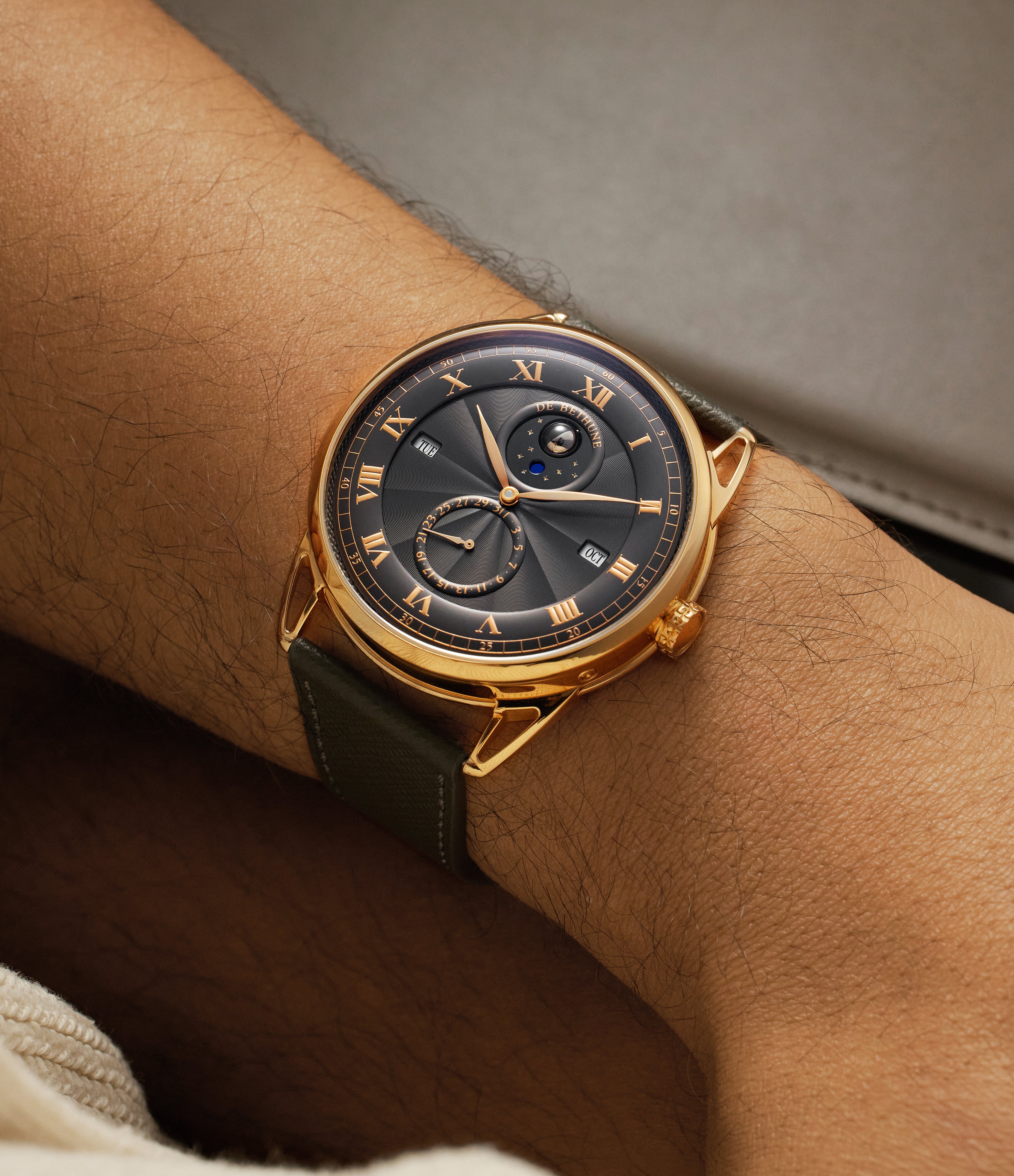 The anthracite dial, with gilt markings, is a suitable accompaniment to the rose gold case. The raised toroidal outer edge wears a chemin de fer minutes track as well as the Roman hours. The pad printing is voluminous and luscious. The central portion of the dial, marginally lower than the minutes and hours chapters, is adorned with a billowing wave-like guilloché, with the pattern segmented into twelve sectors corresponding to the hours. This kind of order is extended to the rest of the dial furniture as well – directly across from each other, at 12 and 6 o’clock, lie the moonphase and date subsidiary registers. Both are framed by toroidal edges. The brand’s signature bi-metal spherical moonphase is monochrome, and the gold disk on which the stars are engraved, is also coated in an anthracite shade. The moonphase is accurate to one lunar day every 122 years. The two windows for the month and day lie across from each other, at 9 and 3 o’clock respectively.