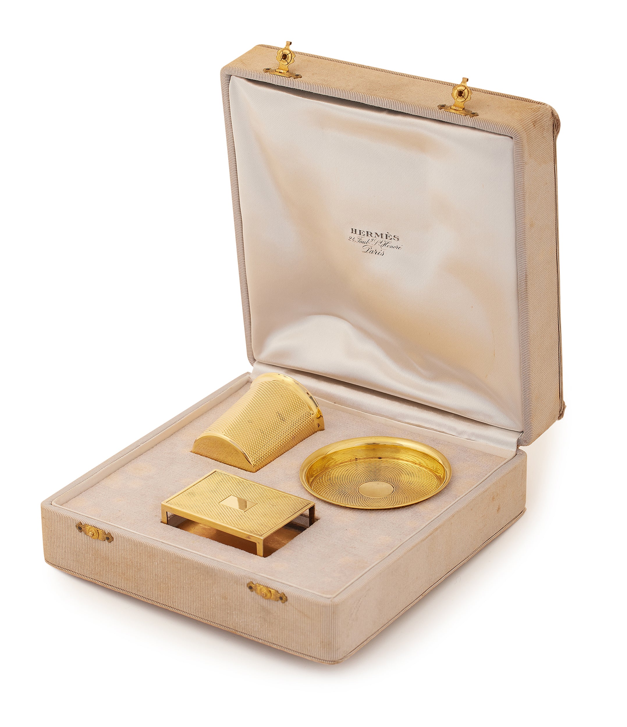 Lift the lid on the grey grosgrain, silk-lined box and discover three solid silver gilt pieces sitting in a fitted velvet setting; a circular ashtray, cup, and match box case.