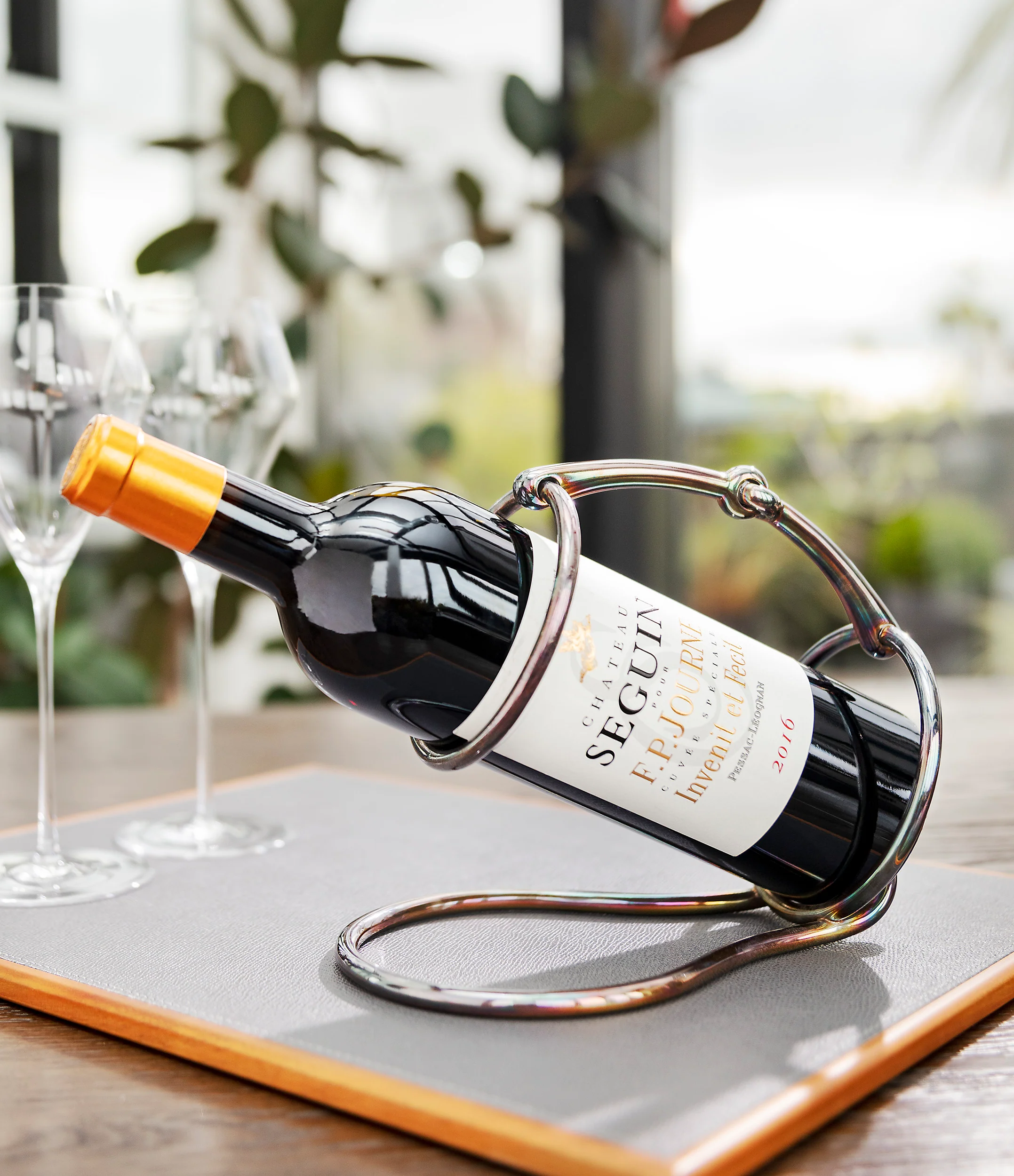 The “snaffle bit” is one of the most common types of bit used – as can be seen from the design, it applies pressure via two main rings, which here, are used to support the wine bottle at the base and neck. A joint connects the base ring to the upper ring, again reminiscent of the horse’s equipment. A small “Hermès, Paris” stamp can be seen along the curve of the link between the two rings.