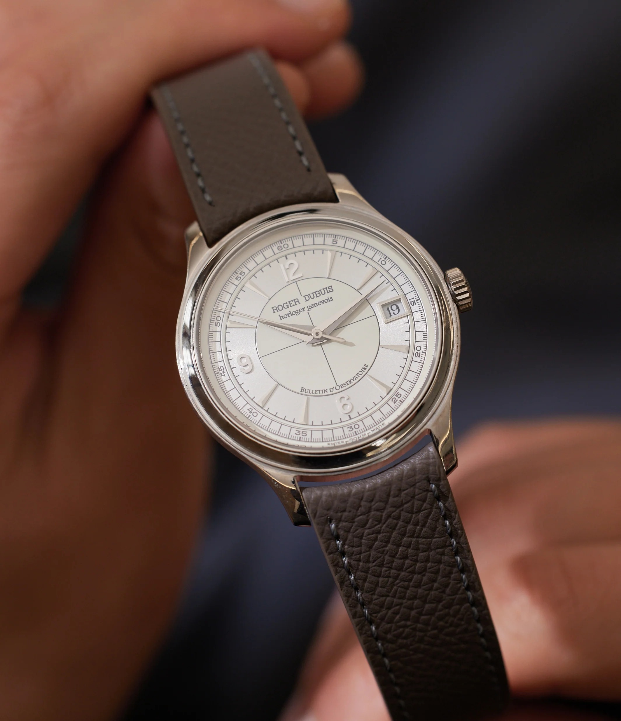 The watch is made from palladium, a rare white metal which resembles platinum, yet is considerably lighter, harder, and more resistant to scratches. Overall, this time-only piece has a modern style, as seen in the sans-serif font of the numerals and the watch’s sleek proportions. However, this is combined with the classic typeface used in the date window as well as the very traditional dial layout, further highlighting Dubuis’ combination of classical and contemporary styles. The centre section of the dial features a sector layout, an attractive layout of the dial that is typically defined by closed concentric circles that segment the dial, and which can be found on a number of vintage pieces.