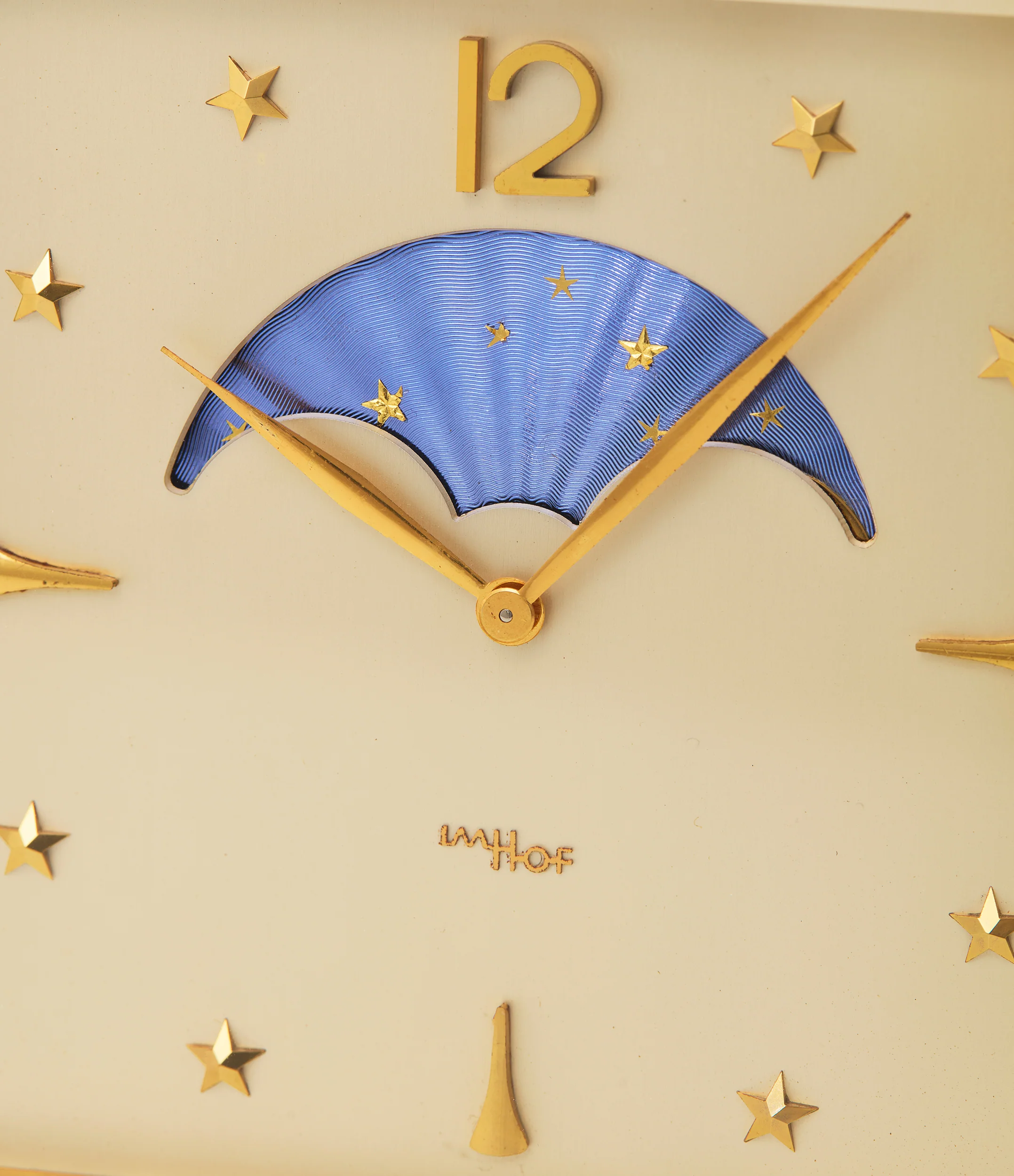 The rectangular case of the clock is a burnished brass, which has aged over the years and developed an antique finish. This is matched by the indices and hands, which are set against a silvered dial. With the exception of the quarter-hours, each hour is represented by an applied faceted star, which give the dial a sense of depth. Below the 12 o'clock indication is a large moonphase in a very traditional style, with the dial creating the illusion of clouds while the moonphase below is rendered in deep blue, with painted stars and moon, demonstrating the lunar cycle. A discreetly placed, applied IMHOF signature lies just above six o'clock and a "SWISS" signature below.