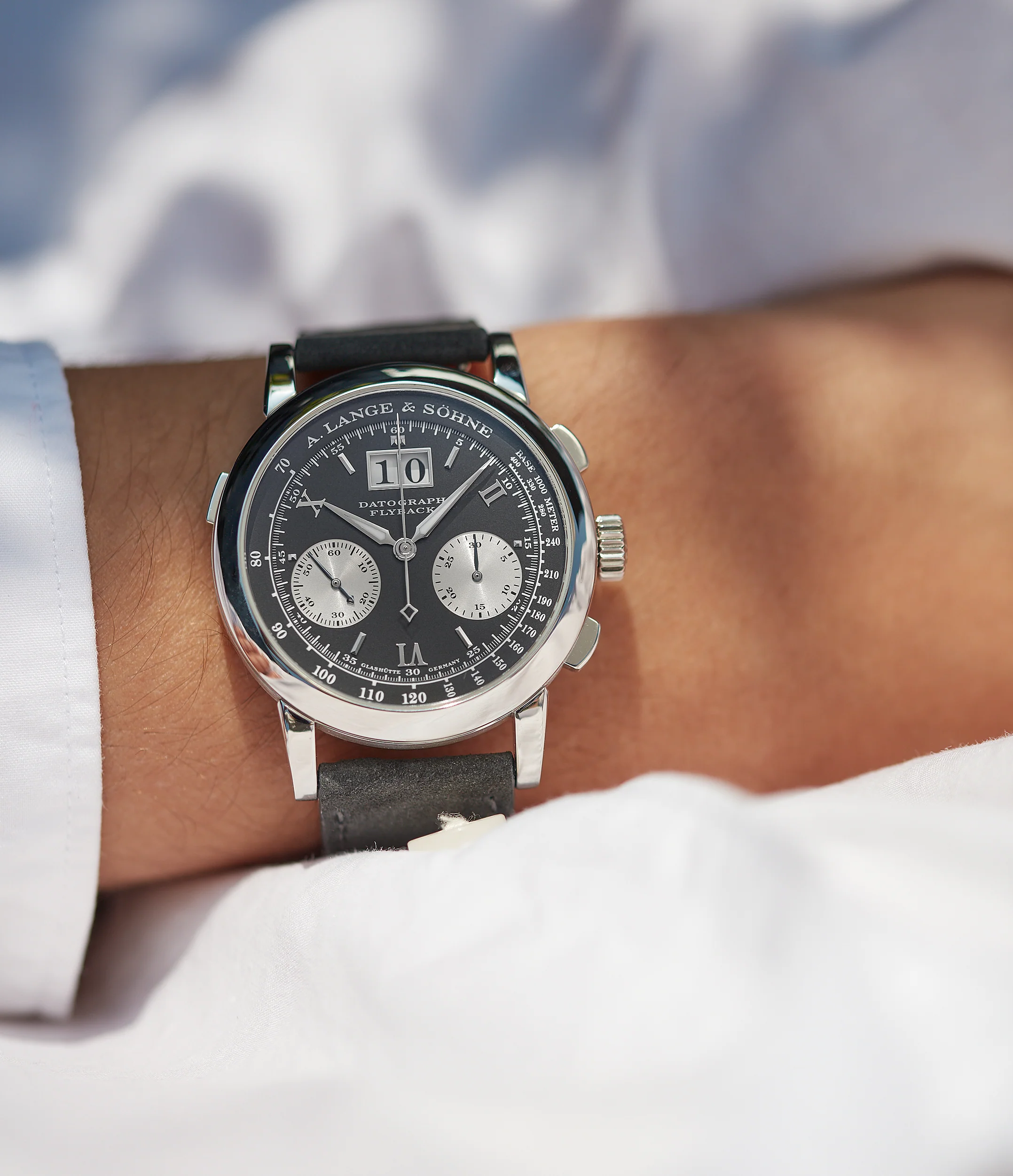 The subdials are slightly recessed, with a warm, creamy tone, which contrasts with the stark, black dial. This layering creates a satisfying level of depth, which becomes especially prominent when light hits the dial at different angles. All the indications are printed in white ink, including a tachymeter scale, which follows the circumference of the dial. The A. Lange & Söhne signature is discretely placed at 12 o'clock. The broad hands are lumed, helping with legibility, and leaning into the more contemporary aesthetics of the Datograph.