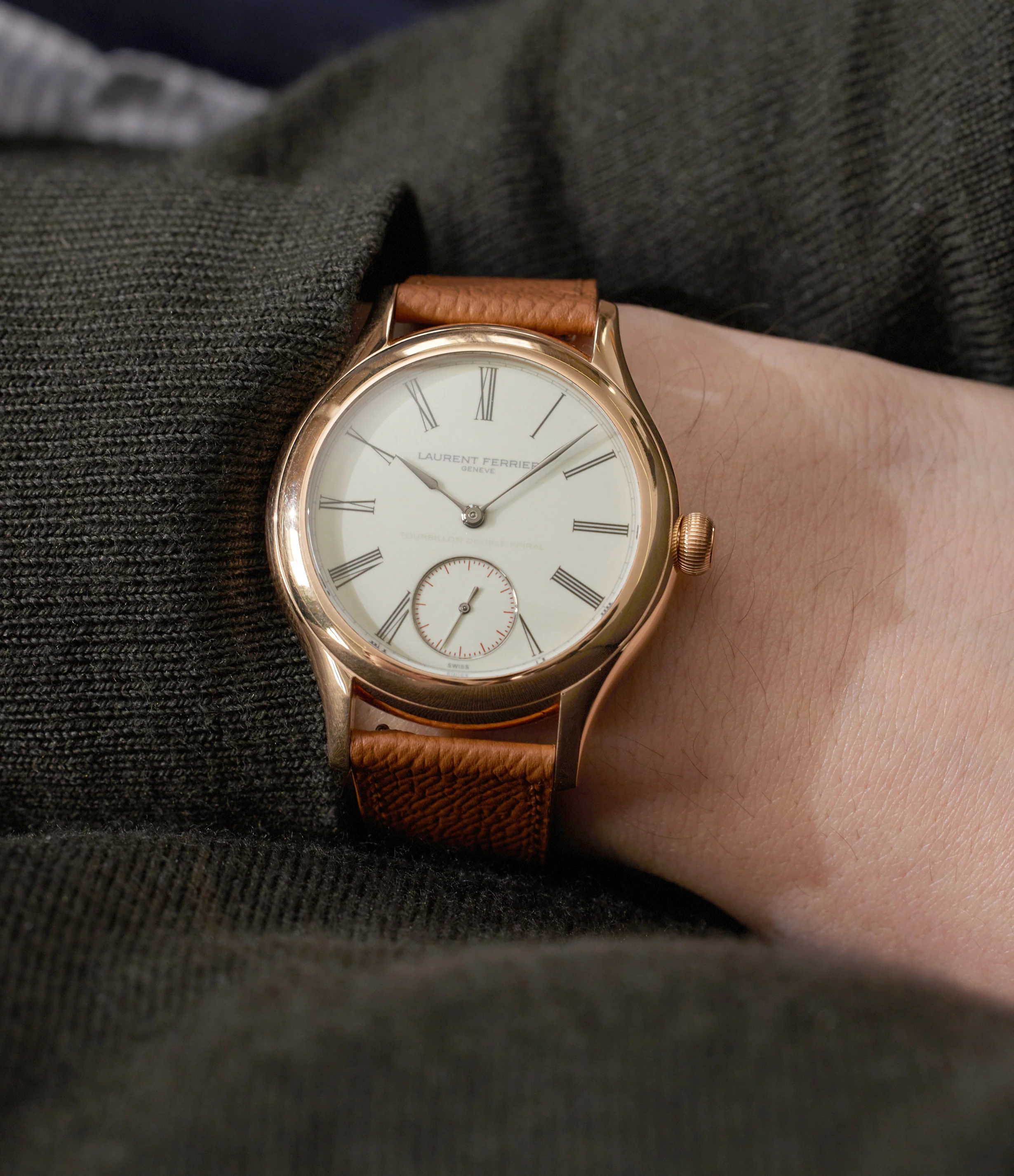 Paris Rive Droite tan grained leather strap, Laurent Ferrier black alligator strap, Laurent Ferrier rose gold buckle |