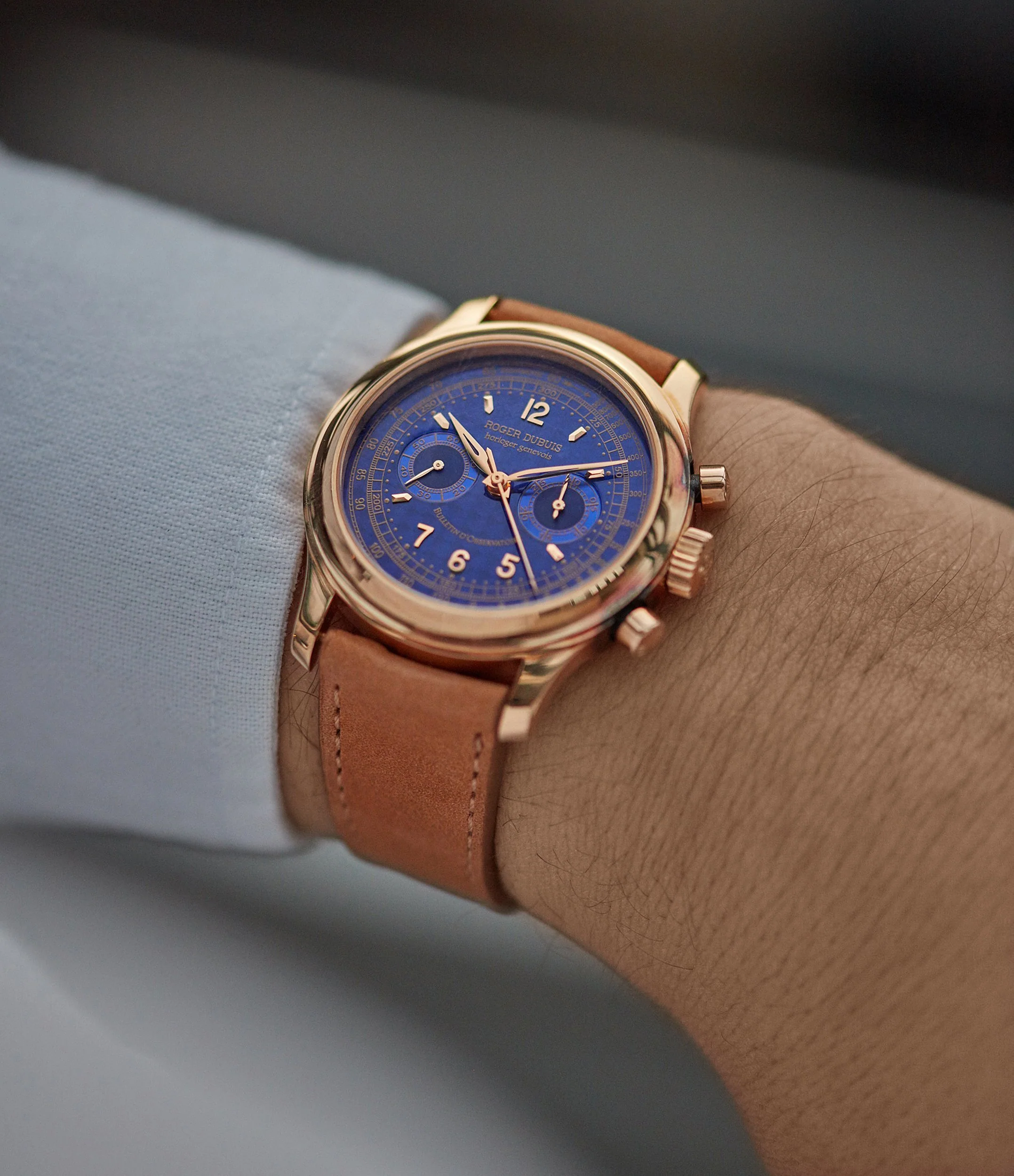 Crafted in Belgium by master leatherworkers, the nubuck leather of this strap is sourced from French tanneries. Nubuck is created from the outer layer of the hide and is top-grain leather that has been sanded down to produce a soft, velvety matte texture that is pleasing to the touch. This type of leather is especially strong and durable.