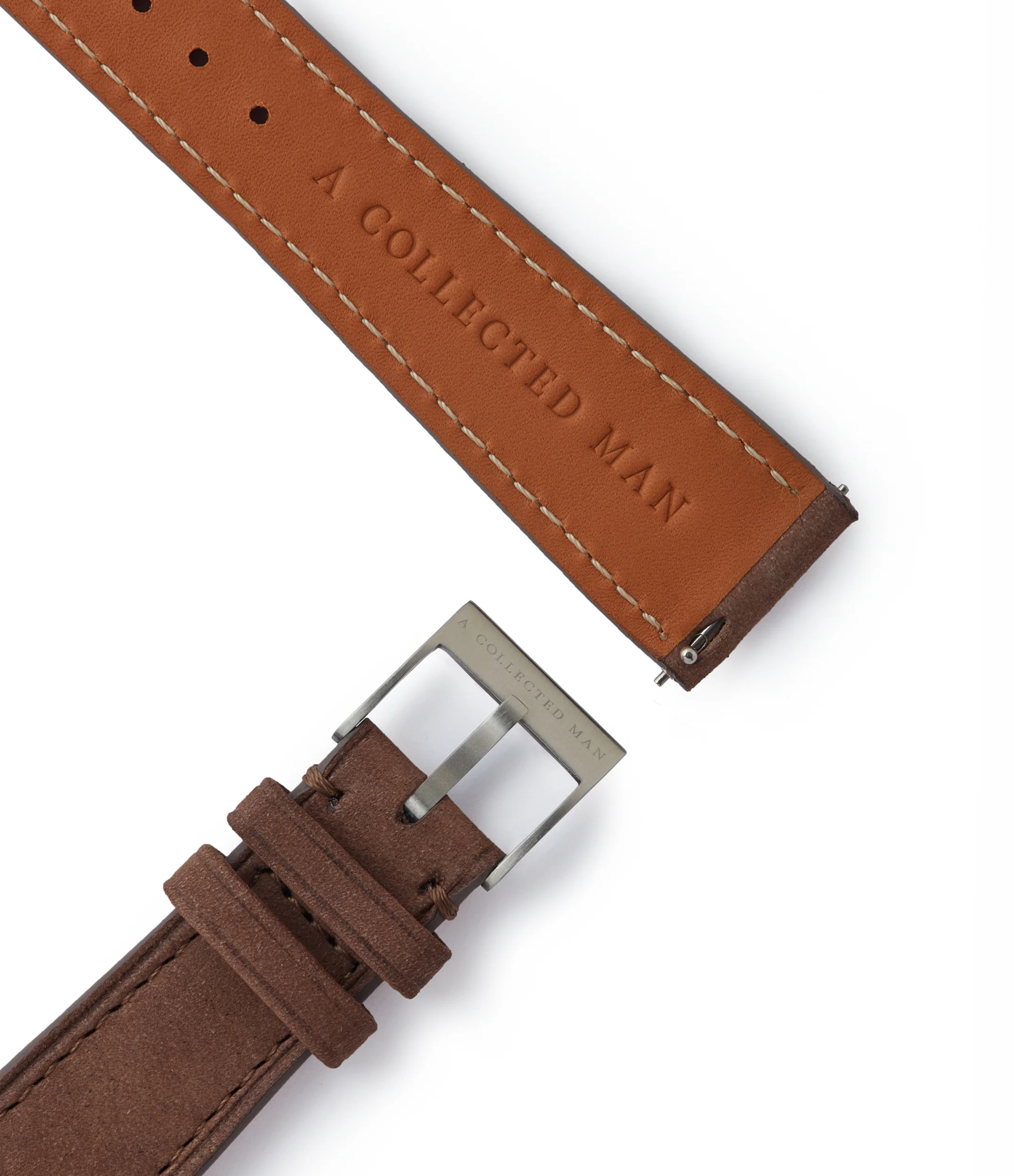 Crafted in Belgium by master leatherworkers, the nubuck leather of this strap is sourced from French tanneries. Nubuck is created from the outer layer of the hide and is top-grain leather that has been sanded down to produce a soft, velvety matte texture that is pleasing to the touch. This type of leather is especially strong and durable.