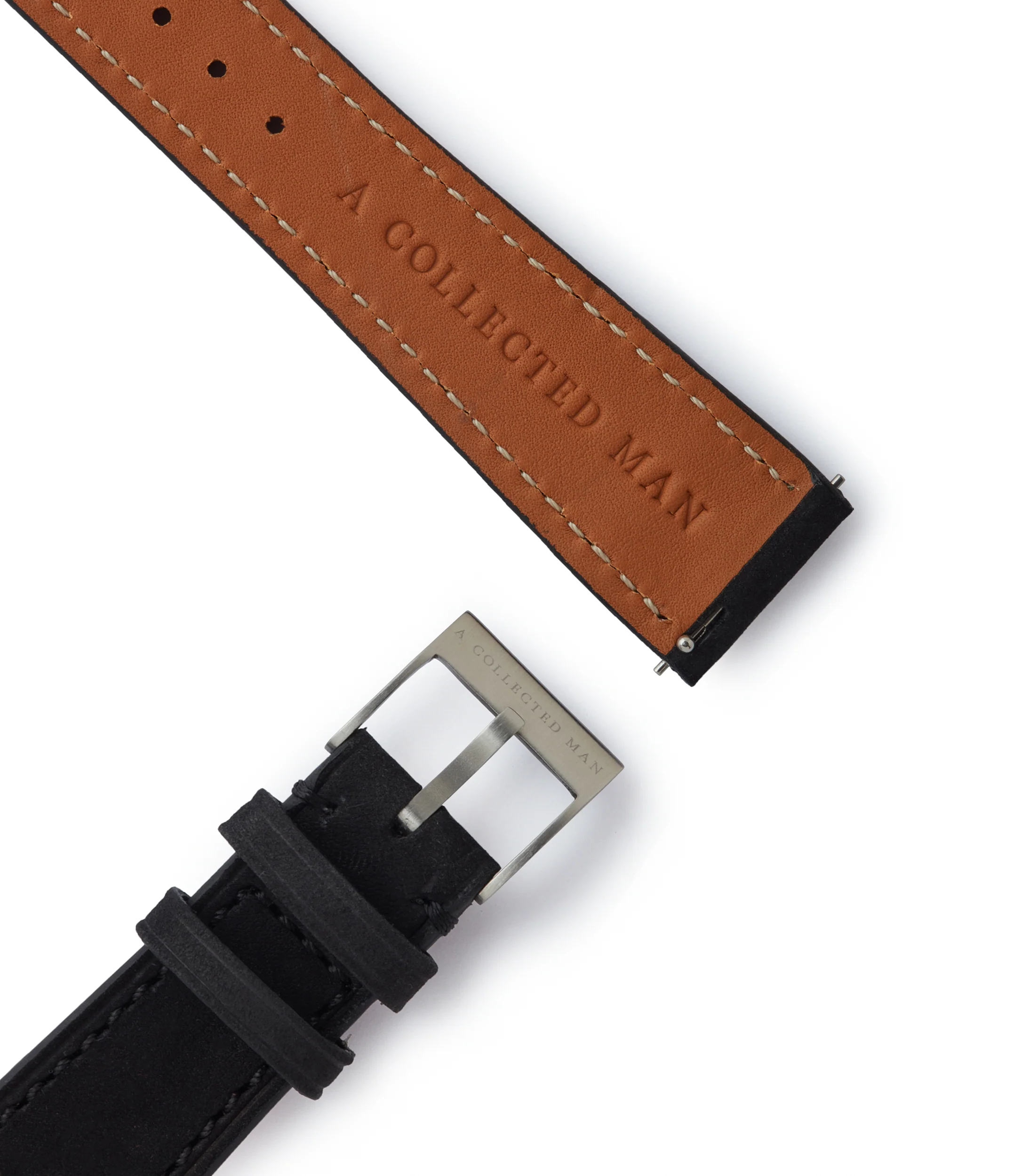 A dependable staple in any collector’s hoard, this black strap is a deep shade of onyx noir and will complement a wide range of watches. The strap features matching open stitching in black.