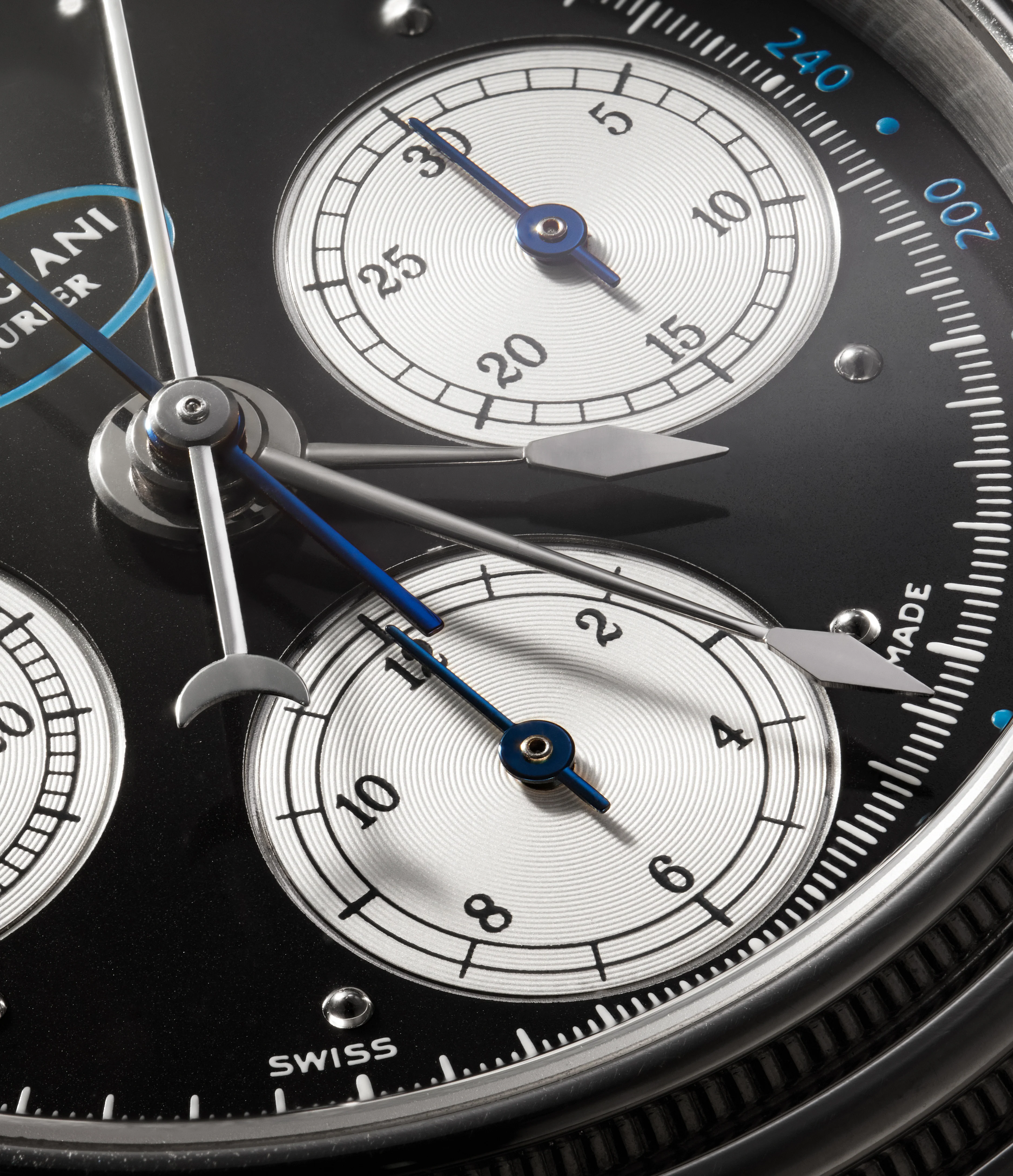 The manufacture’s signature can be found just below the 12 o’clock marker, and is enclosed by a light blue ring in a similar colour that draws subtle attention to the name. The piece also features polished javelin-style hands rendered in silver, which provide a contrast against the rest of the dark-coloured dial. The second hand can also be seen in silver, with a stylised half-moon at the base, while the flying-seconds hand is rendered in blue.