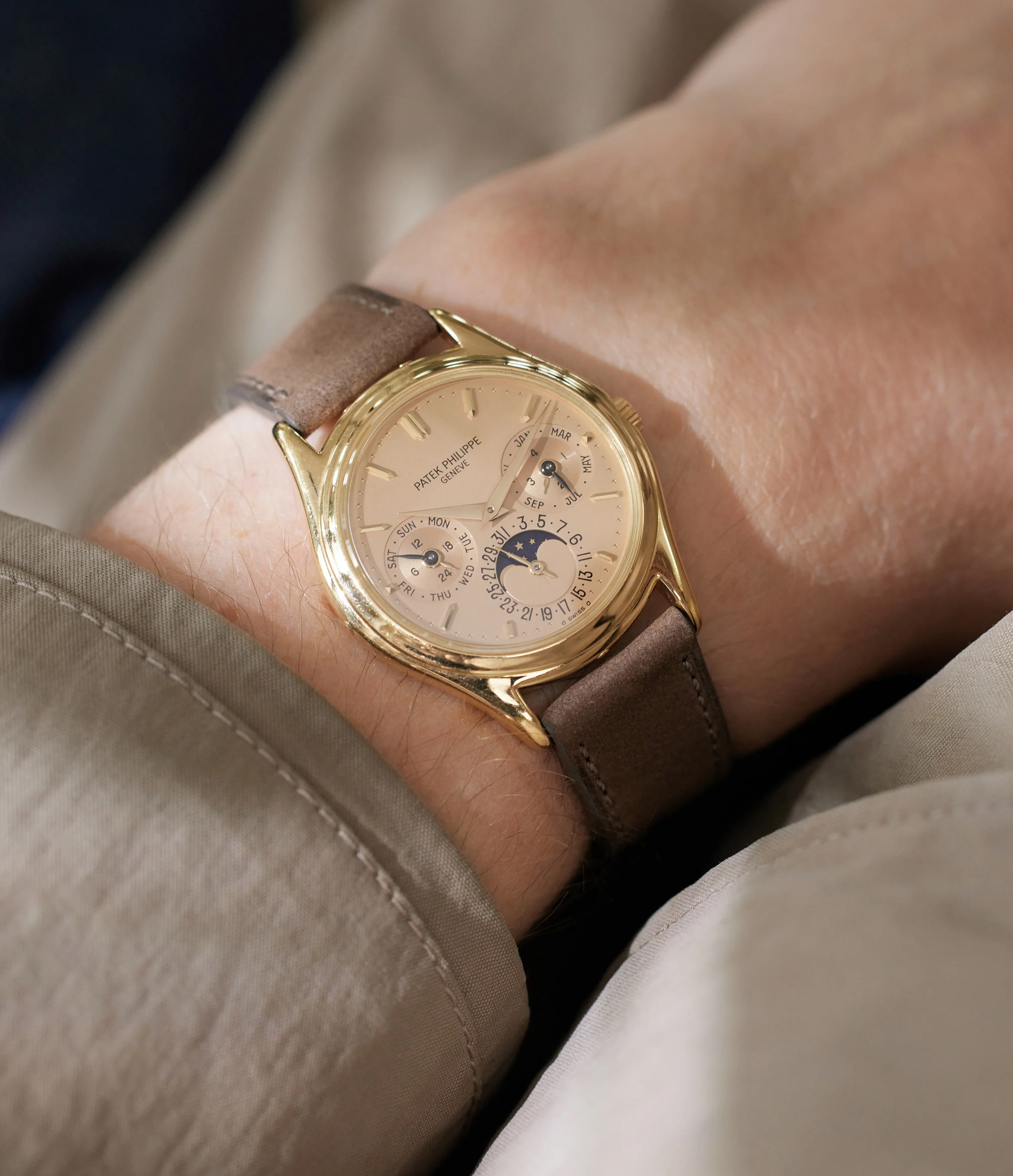 | Strap: | Geneva nubuck strap from our own collection, yellow gold Patek Philippe tang buckle |