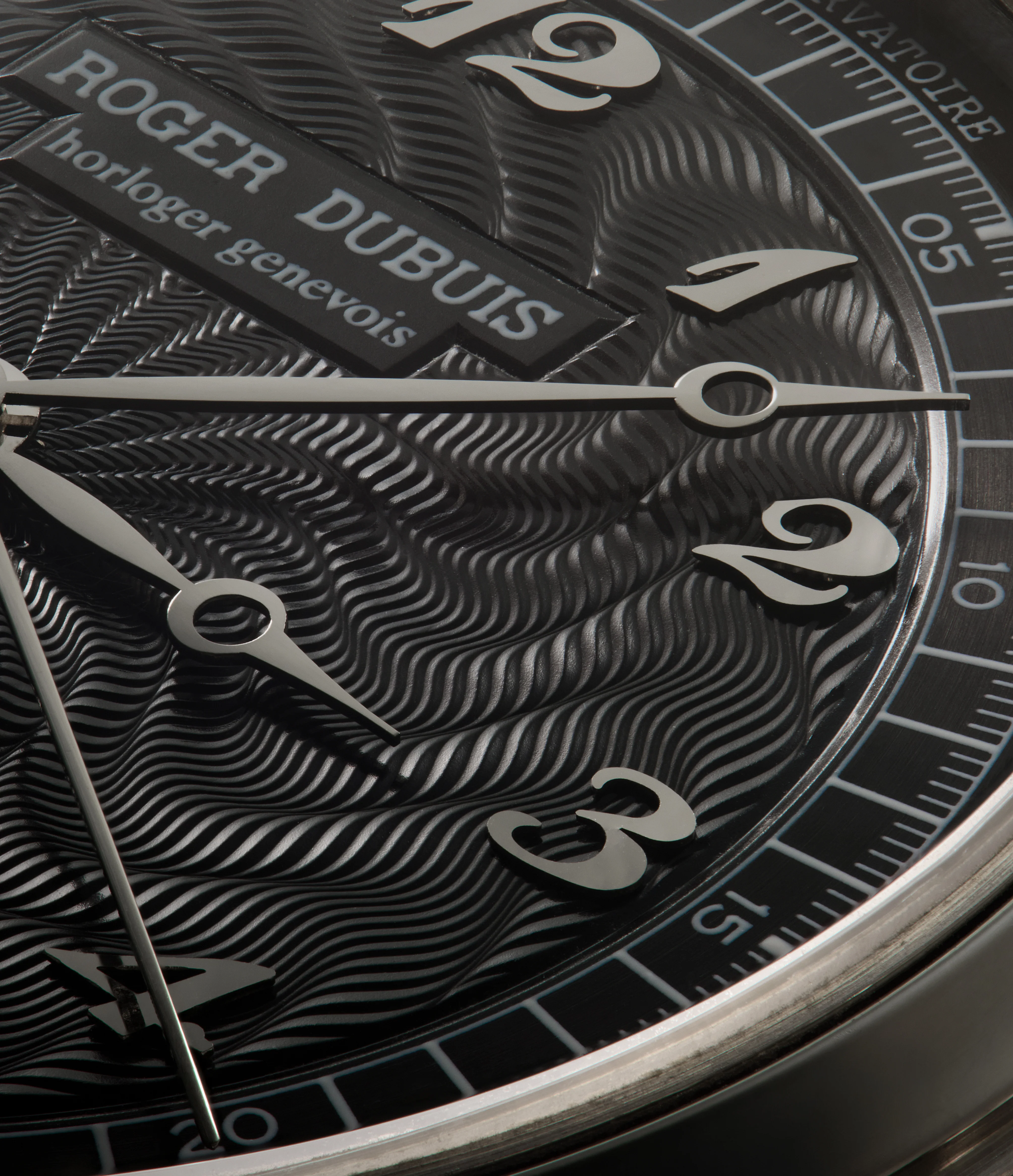 The wave-style guilloché found on the dial stands out especially here, as a signature of Dubuis' brand and also as the textures come through beautifully on the plain, uncomplicated dial. Applied Breguet numerals are used on this example. This style of numerals first appeared just before the French Revolution, when Abraham-Louis Breguet helped to cement the style. Since then, these cursive numerals have been used on a range of prestigious timepieces, though they've become most associated with vintage watches from Patek Philippe. The printed minute track and applied numerals are in white, contrasting against the dark surface. Meanwhile, the hour and minute hands are slightly different from the usual leaf-shaped hands, instead in a corresponding Breguet-style, with a tapered tip, and matching the style of numerals. Notably, in place of the typical "Bulletin d'Observatoire" signature on the dial, a small cartouche can be found, with "guilloché main" inscribed - a nod to the handcrafted nature of the piece.