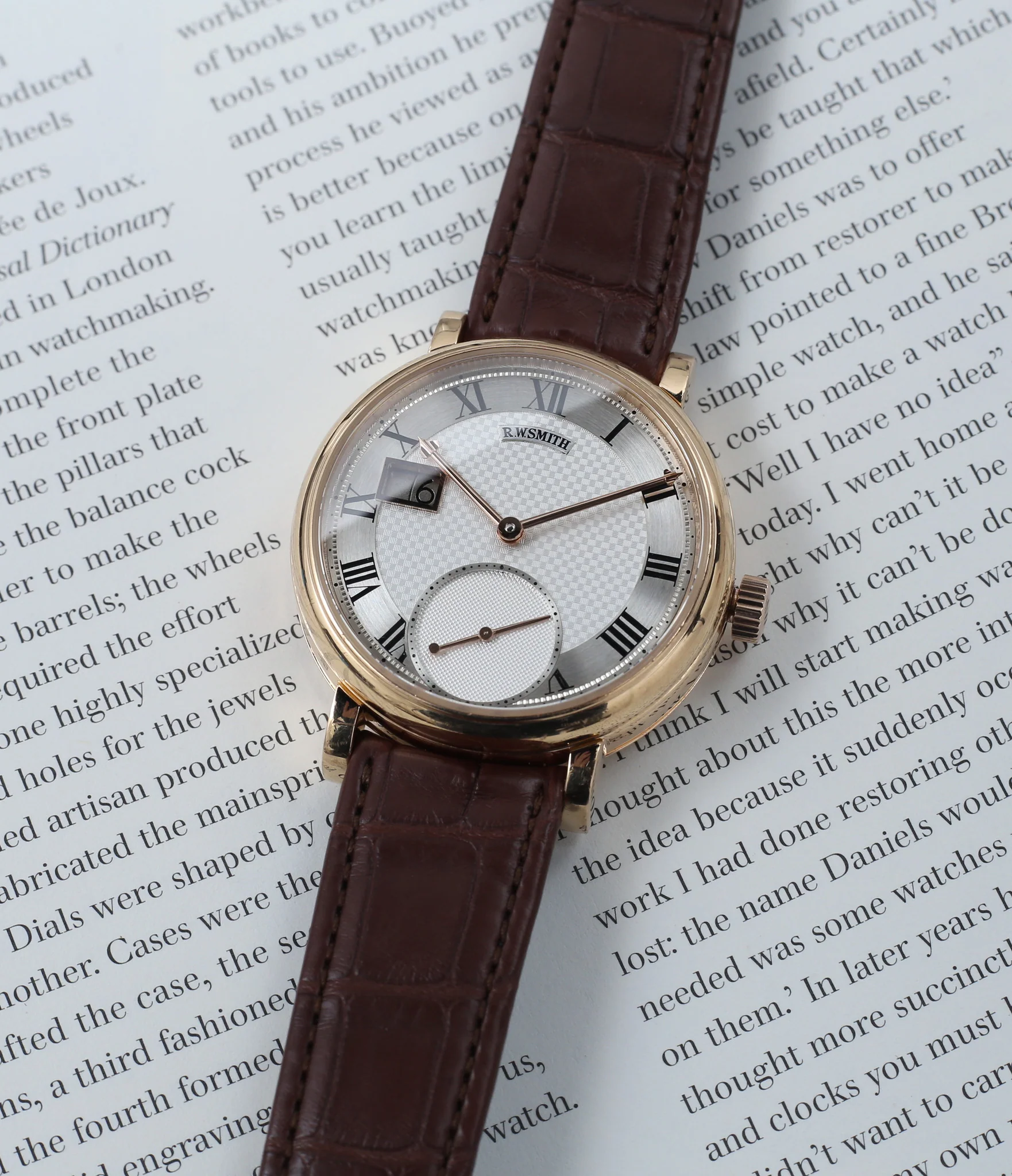 The silver, round dial has an outer chapter ring of drilled and inked black minute markers. The hour markers, in the form of black Roman numeral, are featured on a circular grained chapter ring. The centre of the dial occupies yet another, deeper section, with its hand-turned, basket-work pattern. A cartouche at twelve o'clock references "R. W. SMITH" in black engraving. All parts are hand-made from beginning to end; including the slender, red gold hour and minute hands, tipped with spades, a design feature unique to Roger W. Smith.