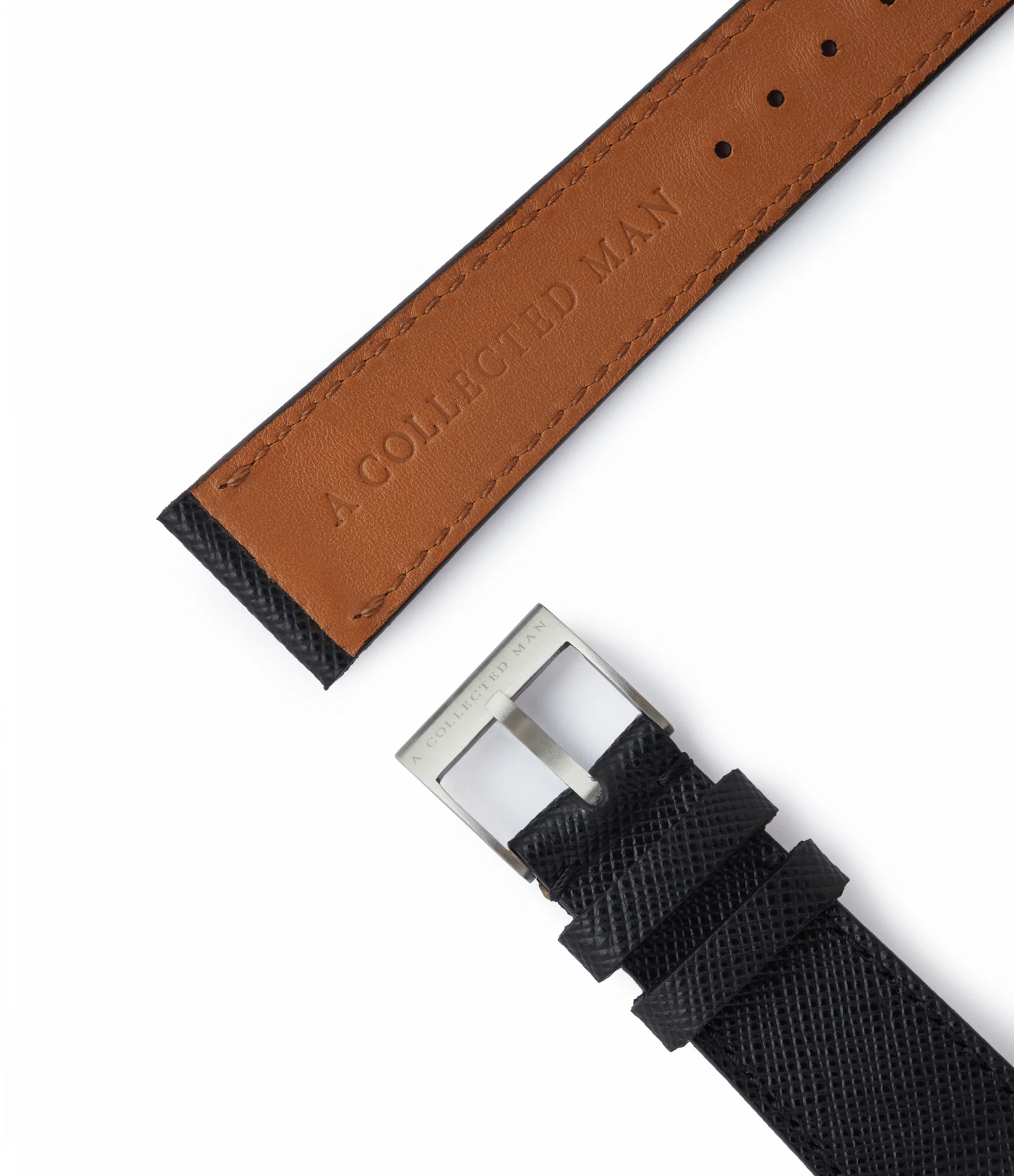Crafted in Italy by master leatherworkers, this Saffiano leather strap is made from full-grain calf skin and is stamped with a crosshatch pattern that seals the grain, making the material extremely durable and easy to clean.