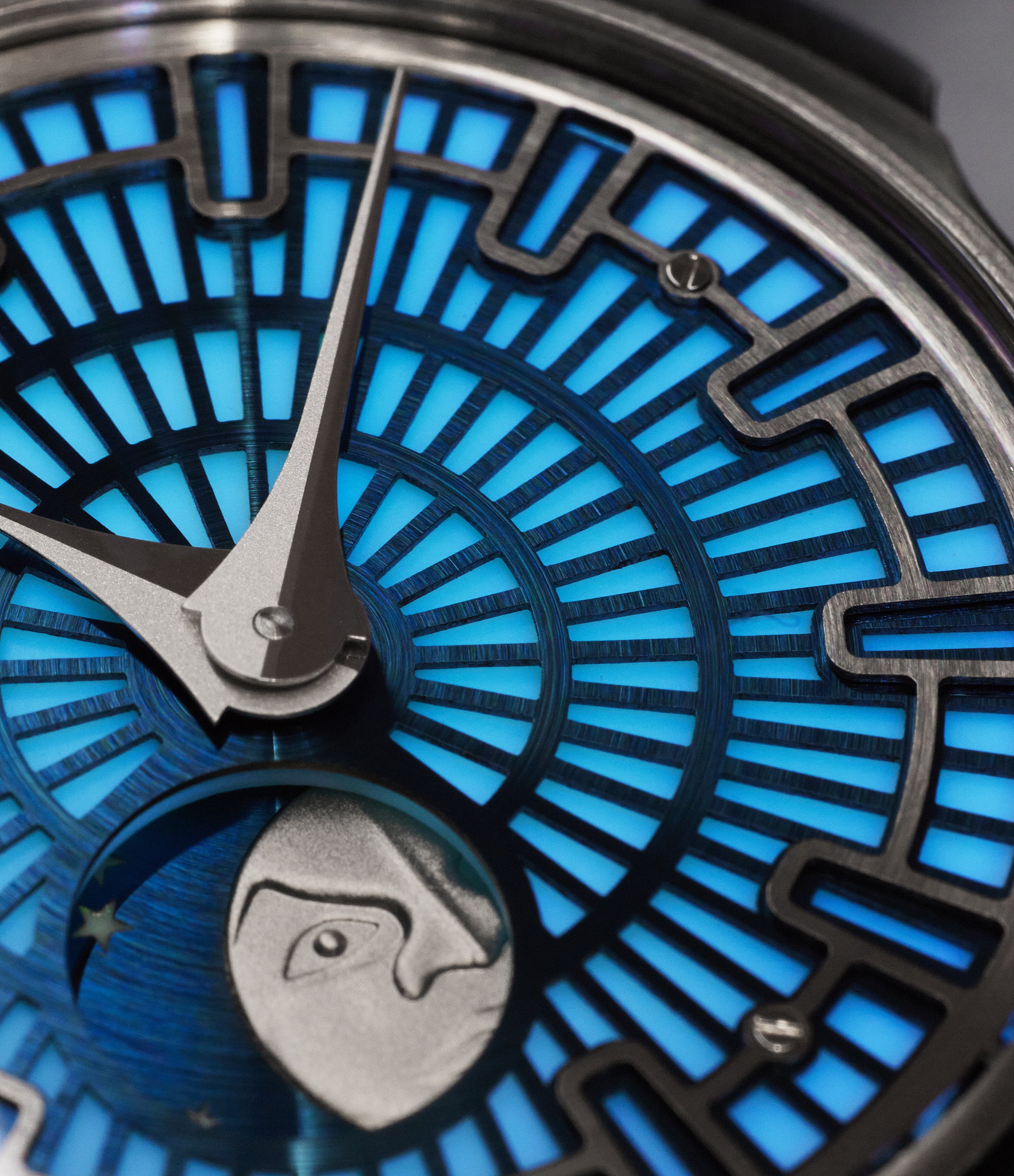 Factors, such as the luminous blue dial and the openworked, scalloped pattern are a familiar staple within Sarpaneva’s oeuvre, and are repeated in a similar fashion with this example. The enigmatic moonphase complication sits at six o’clock, a motif that has become synonymous with the brand, repeated throughout so much of his work. It has been suggested that the face of the moon is in fact a stylised version of Stepan Sarpaneva’s own face, but more distinctly, it is reminiscent of old school pocket watches, but with the watchmaker’s characteristic style.