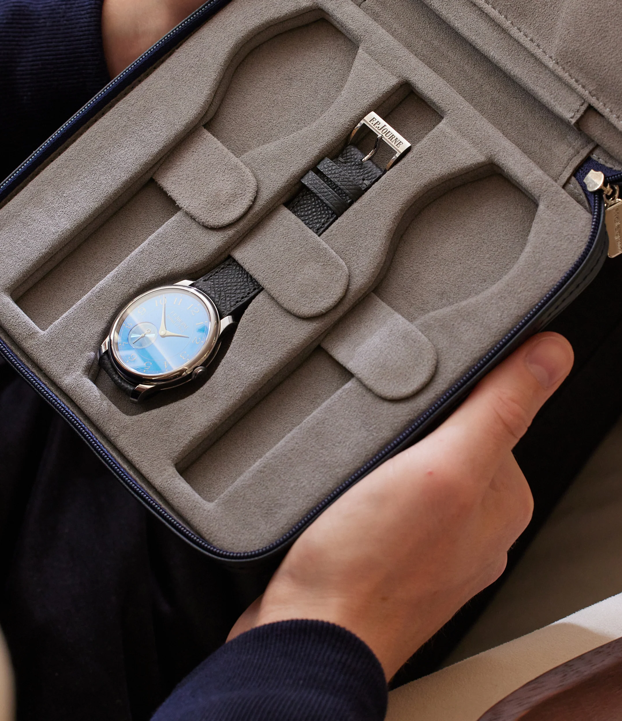 The case is a zip-around folio with a semi-concealed coil zip in a matching colour. The two-part interior is lined in soft, contrasting grey Alcantara and is separated by a padded divider offering ample cushioning. This can be snapped closed, ensuring the watches in the upper part of the case remain in place.