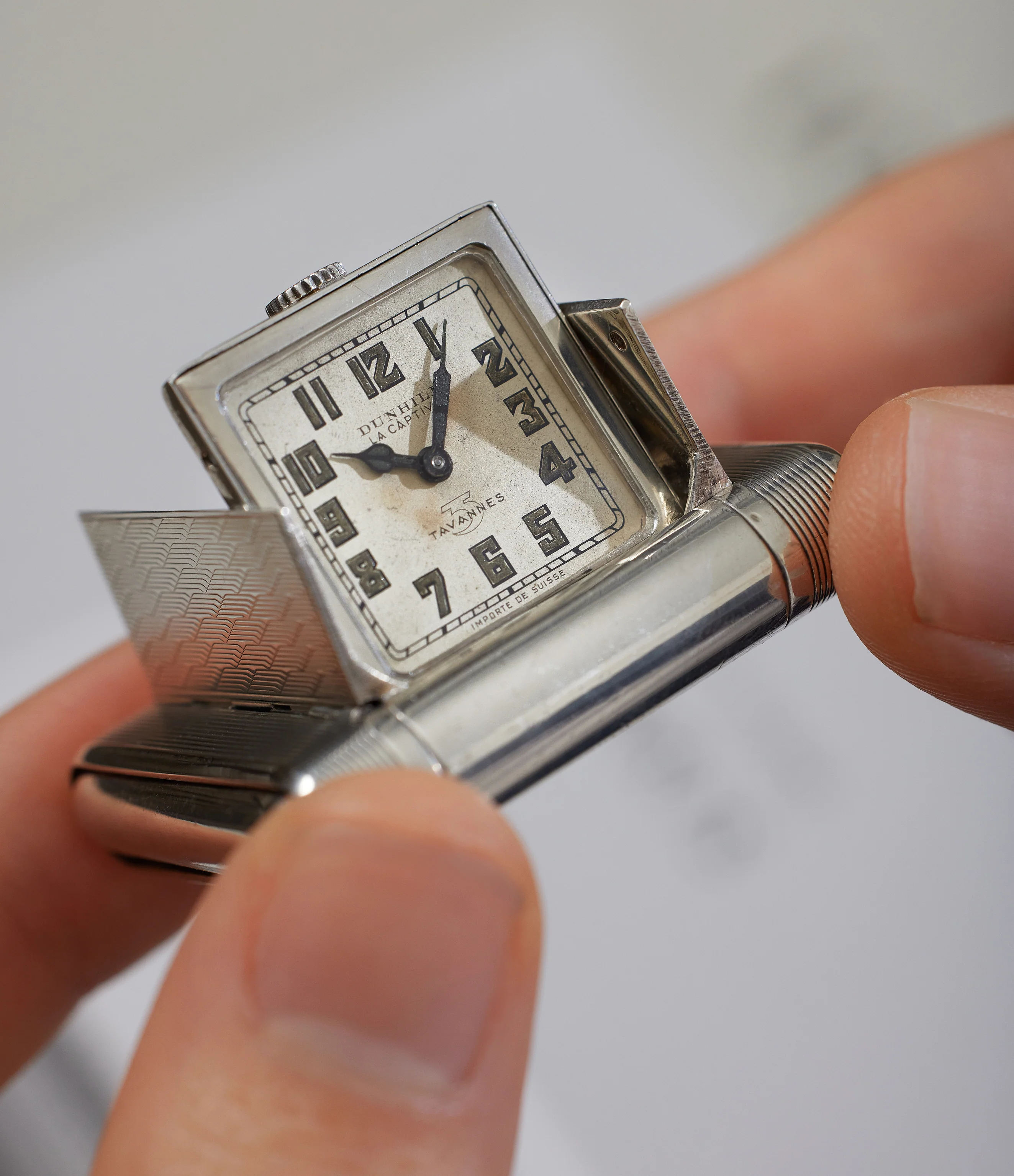 This 1940s double-signed Tavannes & Co. watch also bears the Dunhill signature, where it was retailed. A charmingly-sized piece, the watch is concealed behind a clever mechanism that hides the dial behind two silver shutters that are operated by two pushers on either side.