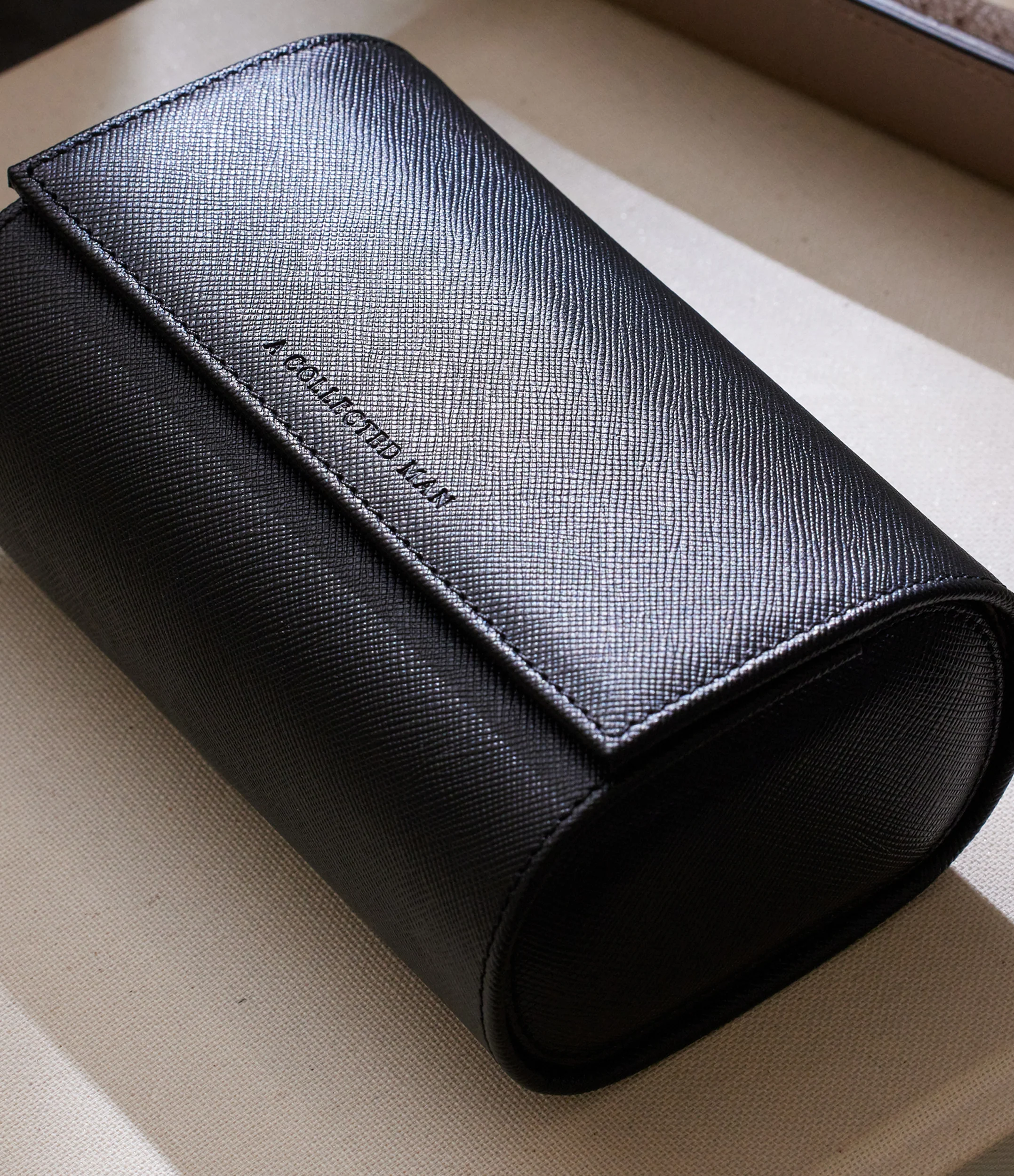 Sleek and sophisticated, the case opens and closes through a simple press stud fastening, with “A Collected Man” subtly debossed on the surface. It’s lined in satin-soft, contrasting taupe Alcantara, and your watches are easily accessible, sitting safely on a removable cushion.